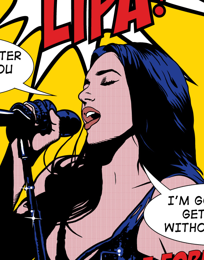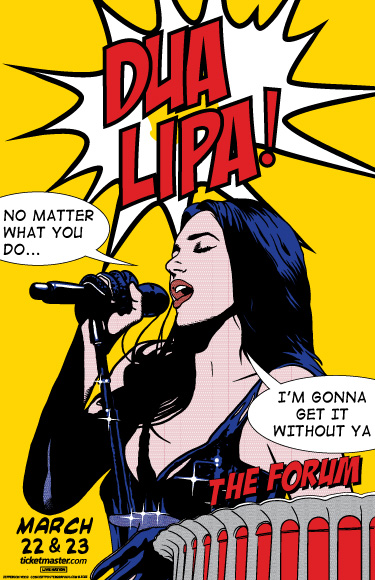 The Dua Lipa 'Pop Art' style poster from her shows at the Forum. A horizontal version of this poster was blown up huge and hung up back stage as well.